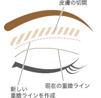 目の上の「たるみ」とりの手術を行う際は、現在二重まぶたの患者様はラインを維持した状態で、現在一重まぶたの患者様はご希望の二重まぶたのラインに沿って切開します。
