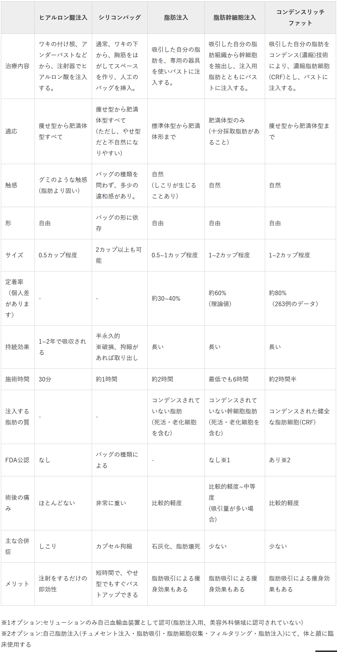 | 治療内容 | ワキの付け根、アンダーバストなどから、注射器でヒアルロン酸を注入する。 | 通常、ワキの下から、胸筋をはがしてスペースを作り、人工のバッグを挿入。 | 吸引した自分の脂肪を、専用の器具を使いバストに注入する。 | 吸引した自分の脂肪組織から幹細胞を抽出し、注入用脂肪とともにバストに注入する。 | 吸引した自分の脂肪をコンデンス(濃縮)技術により、濃縮脂肪細胞(CRF)とし、バストに注入する。 |