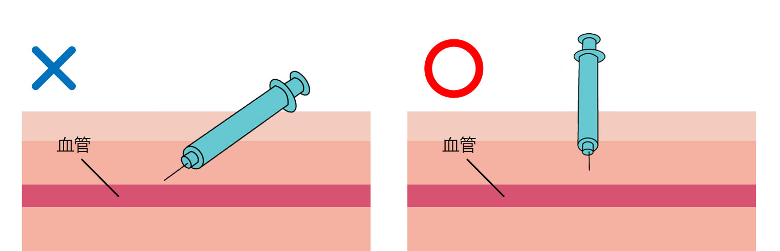 解剖を熟知している事が条件ですが、ヒアルロン酸の注入時は血管に対してできる限り角度をつけ、平行にならないように注入します。血管の走行に平行になるとそれだけ血管中にヒアルロン酸が注入されてしまうリスクは高くなります。また、圧迫し血管内径を小さくして、必ず手で感触を確かめながら、ごく少量ずつ注入する事も大事です。
